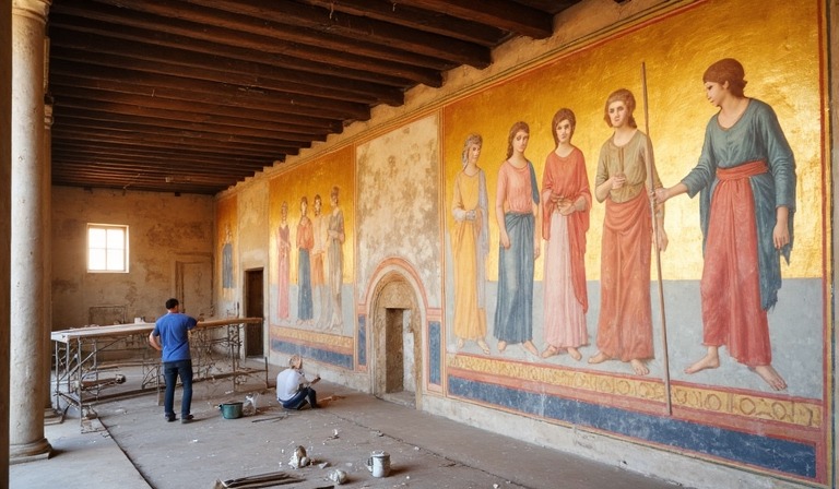 大面积的色彩缺失表明艺术家使用了混合绘画技法(湿壁画和干壁画)。这给修复者带来了额外的挑战,因为不同的技法需要不同的保护方法。