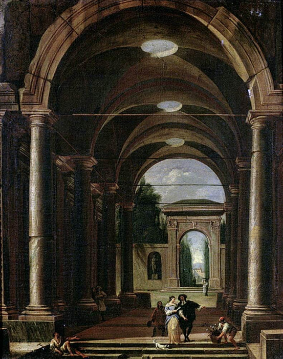 An architectural capriccio with figures by a colonnaded portico, a castle on a sea arch and coastal village beyond — Viviano Codazzi