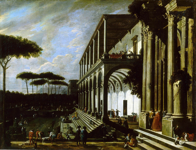 A Capriccio Of The Exterior Of An Elaborate Palace With Saint Peter Healing The Lame — Viviano Codazzi